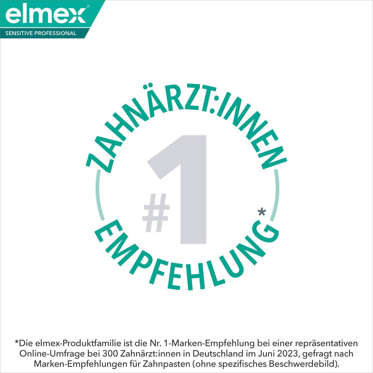 *elmex ist die Nr. 1-Marken-Empfehlung bei einer repräsentativen Online-Umfrage bei 300 Zahnärzt:innen in Deutschland im Juni 2024, gefragt nach Marken-Empfehlungen für Zahnpasten und Mundspülungen mit dem spezifischen Beschwerdebild Schmerzempfindlichkeit.